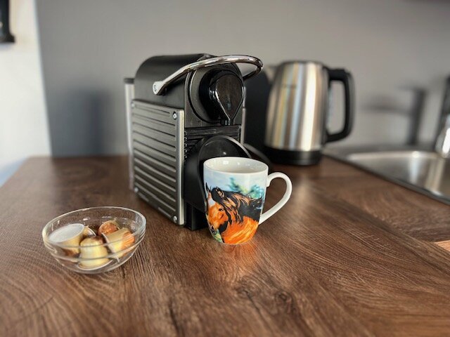 Die Küche ist komfortabel mit Geschirrspüler, großem Kühl-Gefrier-Gerät, Herd mit Backofen und Mikrowelle (Markengeräte) ausgestattet. Außerdem gehören natürlich ein Wasserkocher, ein Toaster und eine Kaffeemaschine zur Ausstattung. NEU-jetzt auch mit Nespresso-Maschine!