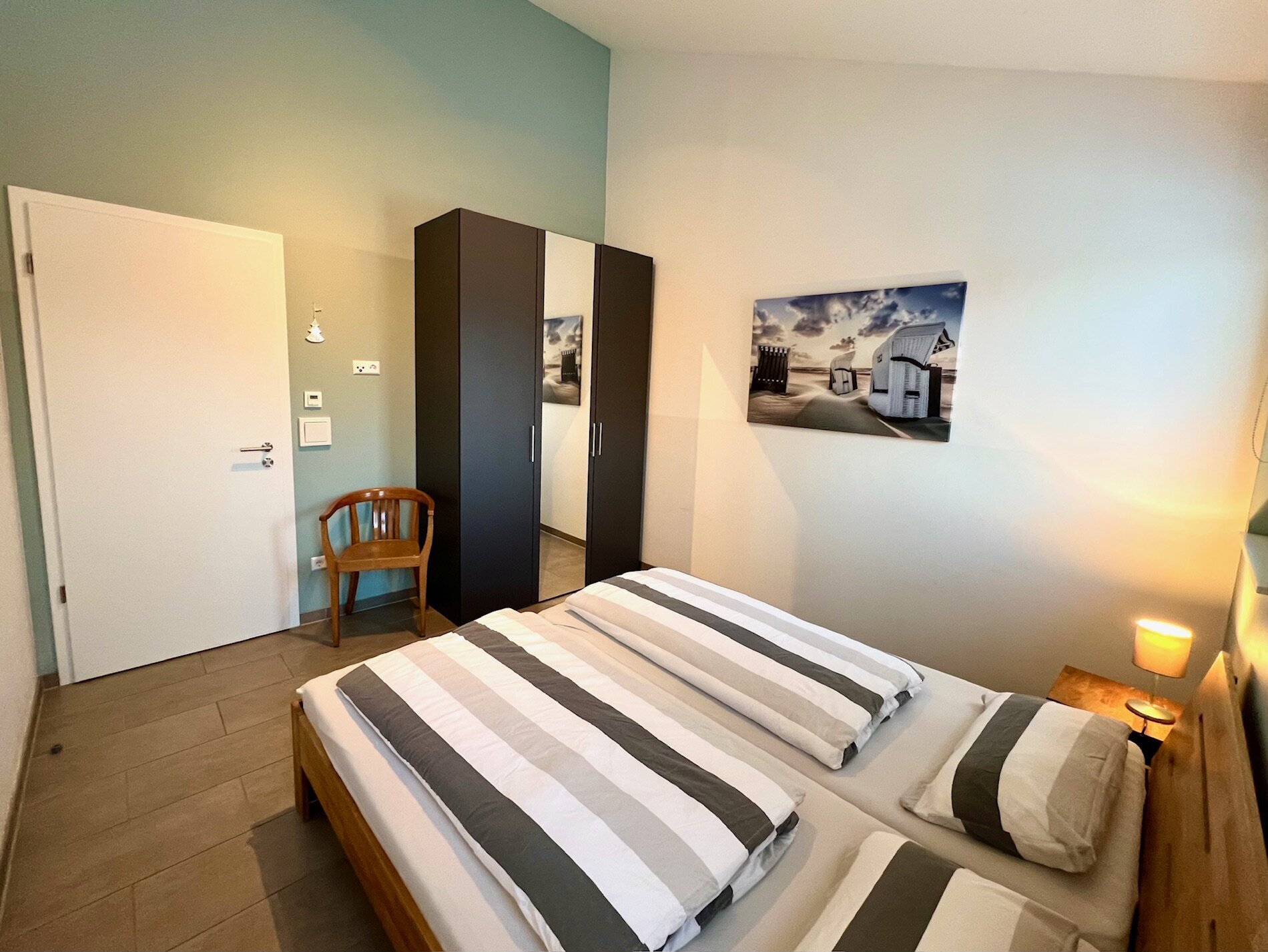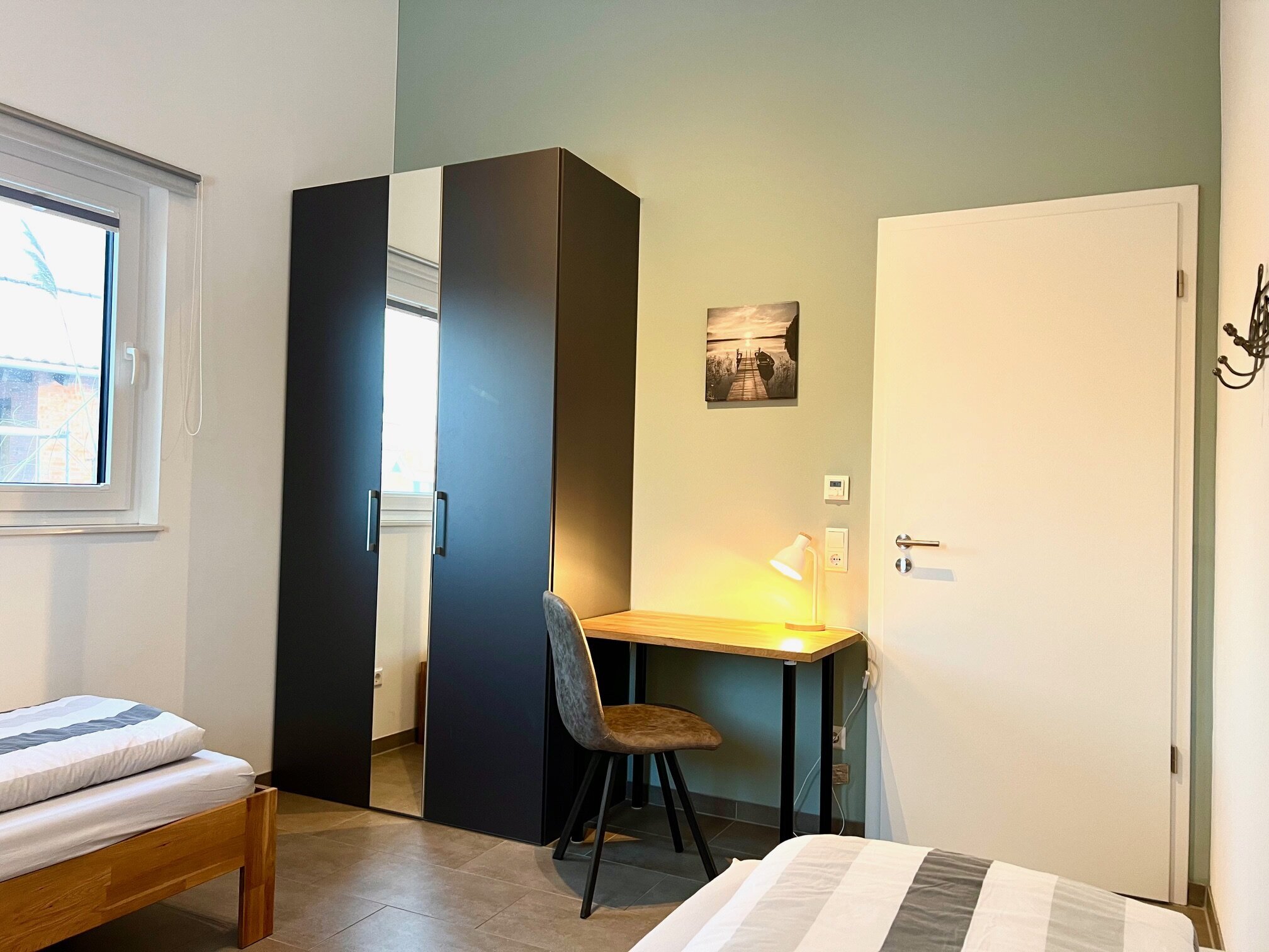 Es gibt 2 gut durchdachte Schlafzimmer (eines mit Doppelbett und eines mit 2 Einzelbetten und Schreibtisch) mit je einem großen Kleiderschrank. Alle Fenster lassen sich verdunkeln.