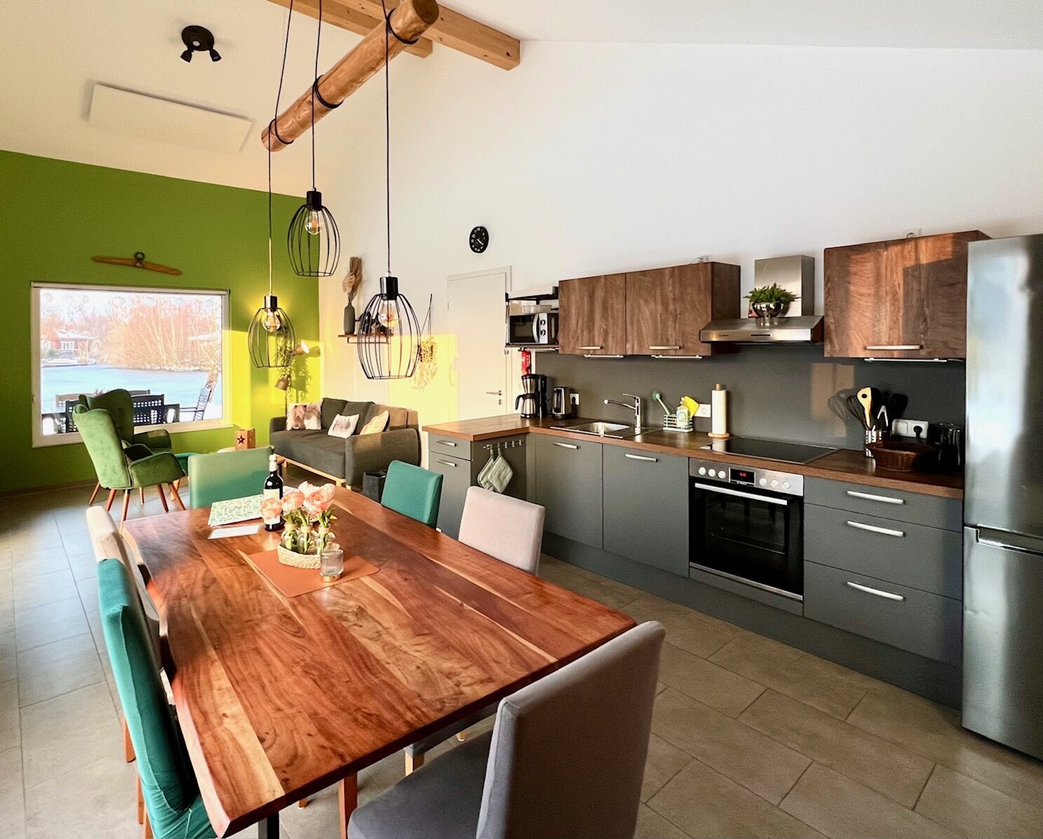 Die Wohnküche ist modern und hochwertig eingerichtet. Auf der Schlafcouch können 2 weitere Gäste bequem übernachten.