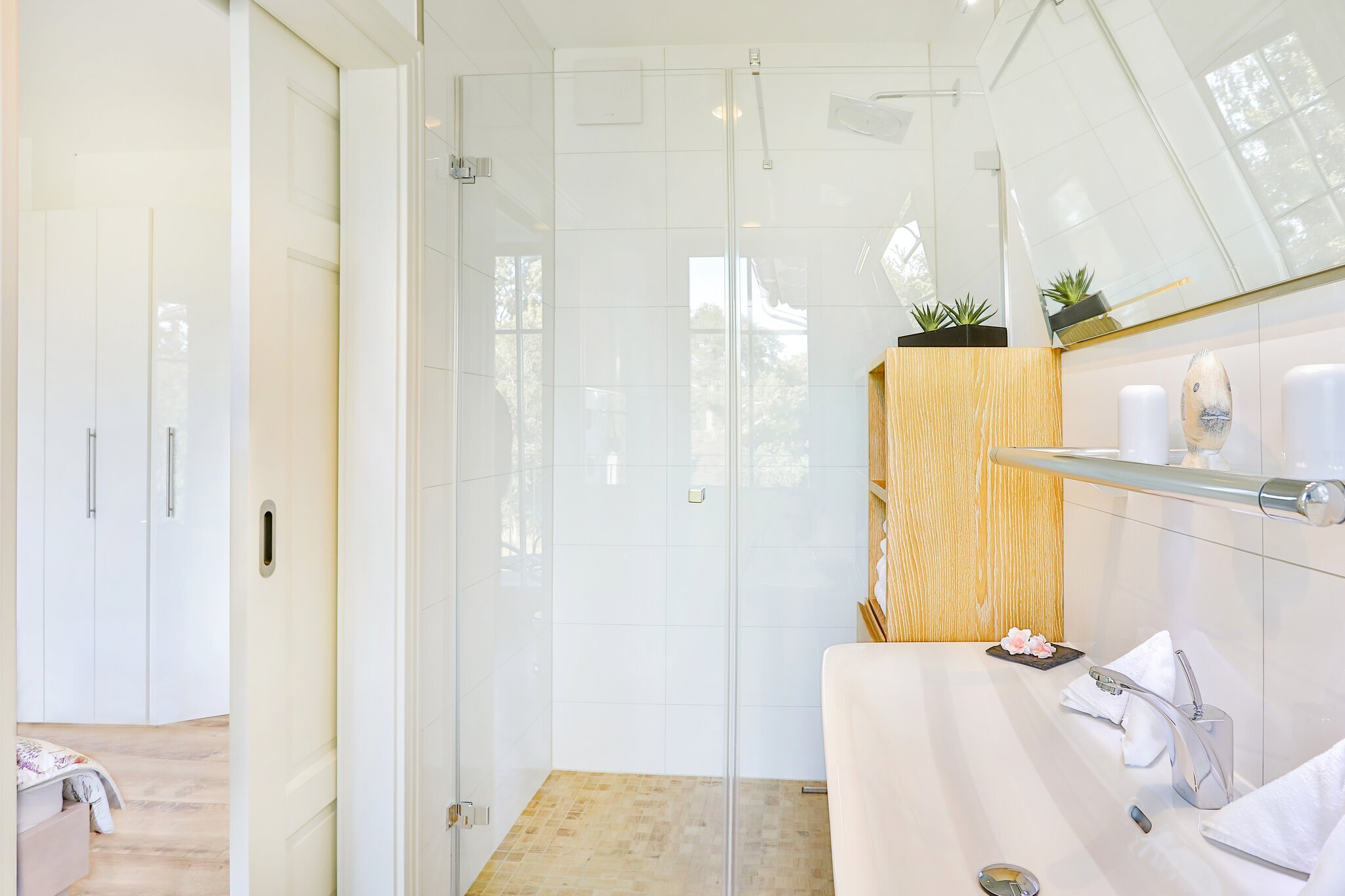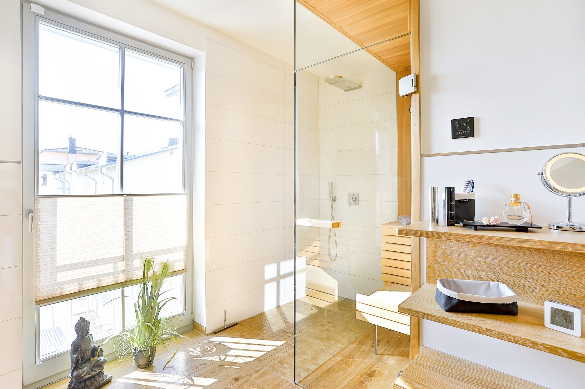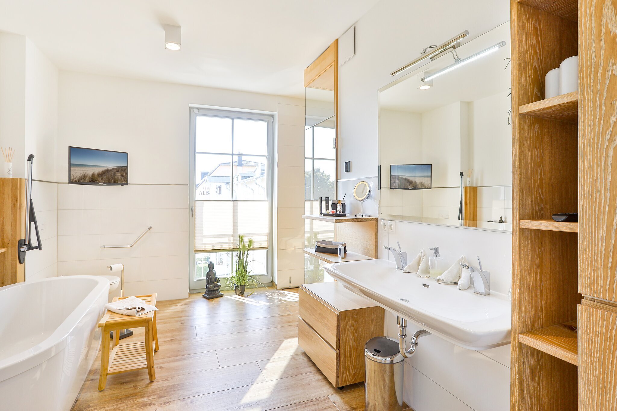 In dem großen Wellnessbad befindet sich eine ebenerdige Regendusche, ein großes Doppelwaschbecken und eine freistehende Designer-Badewanne und eine Sauna mit Panorama-Glasfront. Ihr exklusiver Komfort wird durch ein LED-TV, Kosmetikspiegel, Haartrockner und elektrische Handtuchheizkörper abgerundet. Ein weiteres kleines Bad befindet sich en Suite an einem der beiden Schlafzimmer zur Meerseite und verfügt über eine ebenerdige Regendusche, Waschbecken und Kosmetikspiegel. Weiterhin steht Ihnen eine Waschmaschine, Trockner, Bügeleisen und Bügelbrett und Reinigungsutensilien im Hauswirtschaftsraum zur Verfügung.