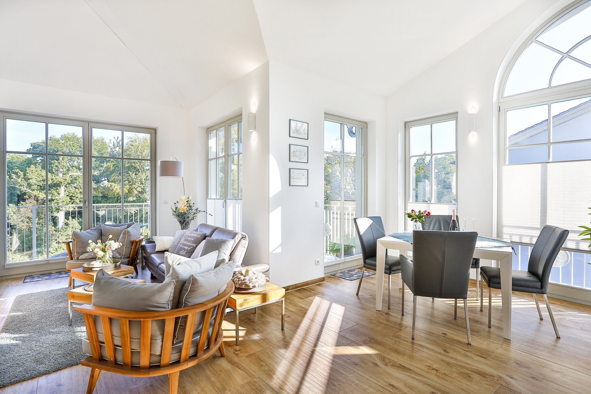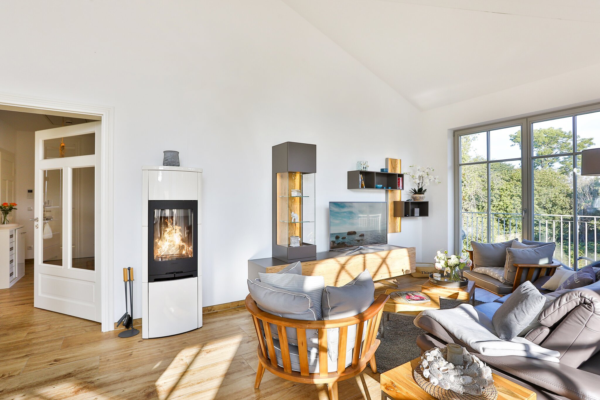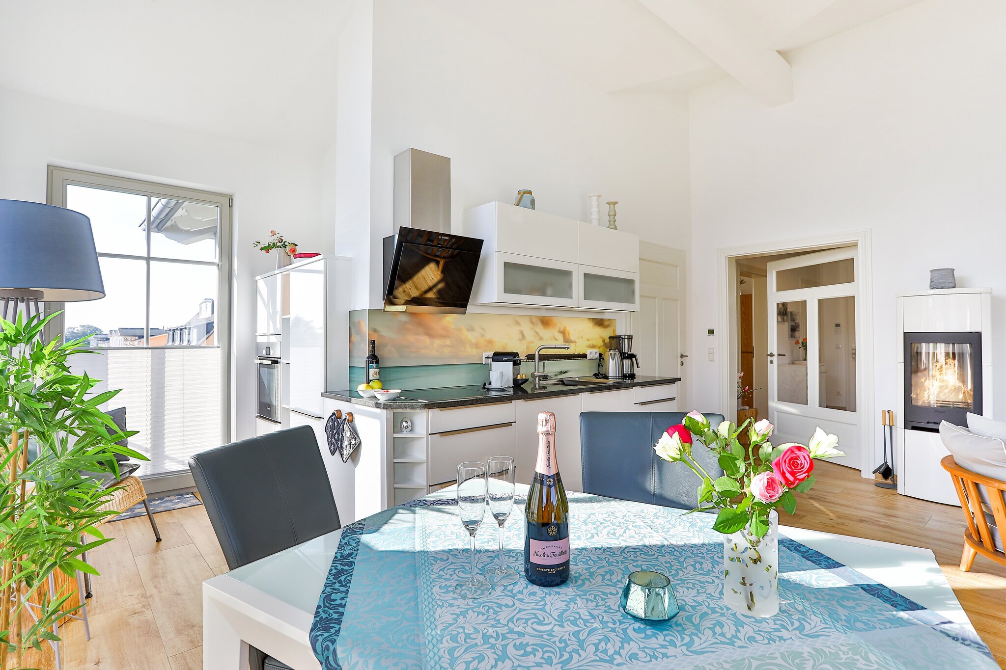 Auf 107 qm erwarten Sie zwei Schlafzimmer mit Smart-TV, zwei Bäder sowie zwei Balkone mit Blick auf die malerische Landschaft und die Ostsee je nach Jahreszeit mit Meeresrauschen inklusive. Sie fahren mit dem Fahrstuhl barierefrei bis in die 2. Etage der Villa Pauline und betreten einen kleinen seperaten Flur. Auf der rechten Seite befindet sich die Eingangstür zur Penthouse-Wohnung. Die Wohnung besticht durch ihren nachhaltigen, modernen und gemütlichen hellen Wohnraum, der durch einen Kamin für eine wohlige Atmosphäre im Herbst und Winter sorgt.