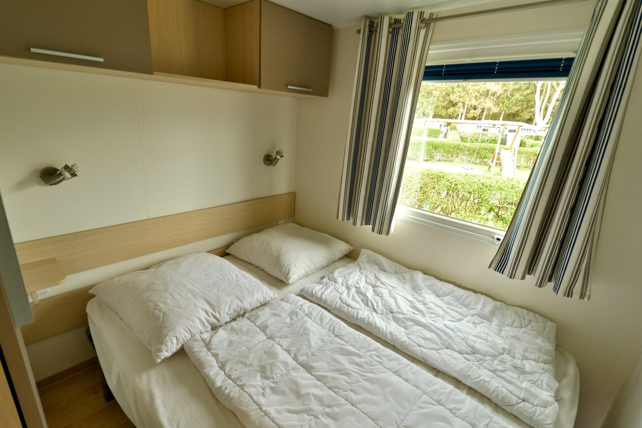 Die Unterkunft ist eine fest installierte Wohneinheit mit dem Komfort einer Ferienwohnung. Auf 34 m² stehen Ihnen zwei Schlafzimmer mit einem kleinen Doppelbett bzw. zwei Einzelbetten, ein Wohnraum mit Küche, Sitzecke und SAT-TV sowie ein Bad mit Dusche und ein separates WC zur Verfügung. WLAN ist kostenfrei nutzbar. Die überdachte Terrasse mit Holzmöbeln bietet Platz für Mahlzeiten im Freien, Fahrräder können direkt am Mobilheim abgestellt werden. Außerdem gehört ein Pkw-Stellplatz zu jedem Mobilheim und Sie können die Annehmlichkeiten, wie Waschküche, Spielplatz und Grillplatz im Ferienpark mitnutzen. Haustiere in den Mobilheimen nicht erlaubt.